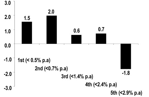 Среднее значение курсовой доходности фондового рынка на примере 31 страны (как развитые, так и развивающиеся страны). Страны сгруппированы в квинтили в соответствии с темпами роста населения